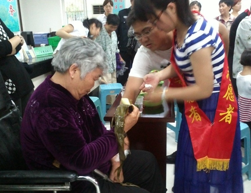 残疾人陆某与他的年逾古稀、身体尚健的老母亲在志愿者的帮助下参加了江阳社区“幸福家庭”裹棕联谊赛,与其他五个参赛家庭比拼包粽子的手艺。大家一齐动手,现场气氛十分融洽。同时,志愿者们还特意邀请贫困残疾人来到现场品尝粽子,让他们一起感受端午佳节的温馨,感受社区的温暖、社会的关爱。联谊赛结束后,细心的志愿者们还冒雨为那些出行不便的残疾人送粽上门,将这份爱心亲自送到他们家中。